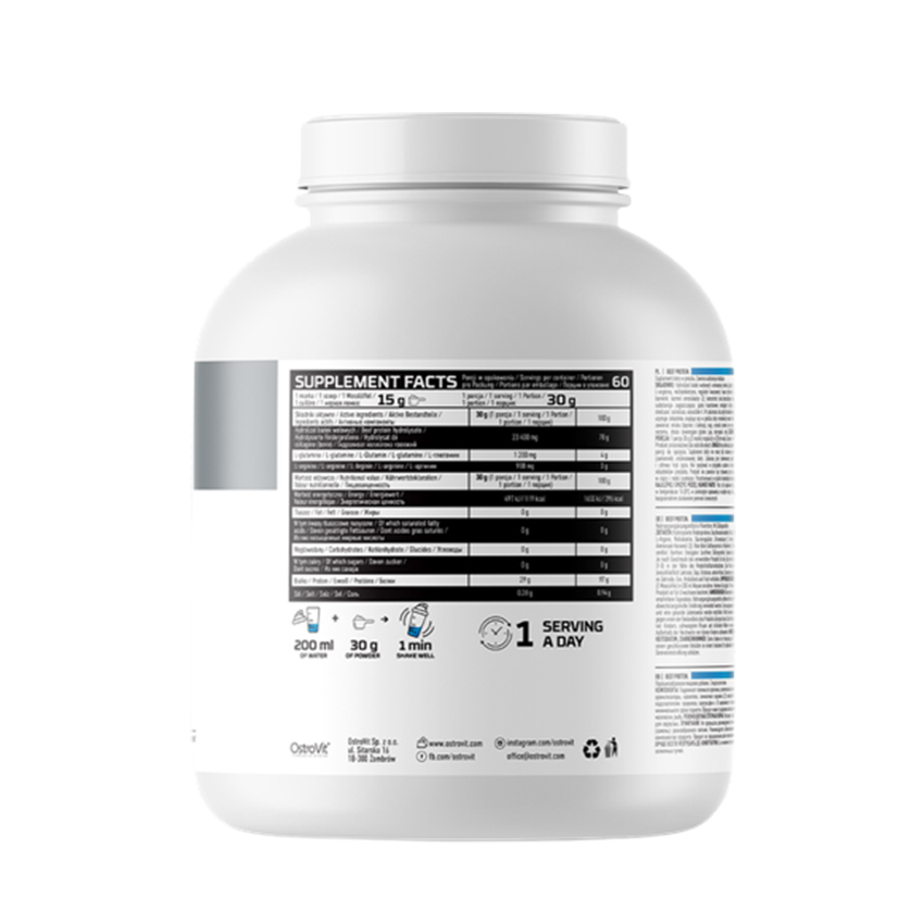 OstroVit Beef Protein là protein thủy phân từ thịt bò có chất lượng cao nhất, được coi là nguồn protein tinh khiết nhất được sử dụng trong chế độ ăn kiêng của vận động viên, đặc trưng bởi tính khả dụng sinh học cao và giàu axit amin. Sản phẩm được tạo ra cho tất cả những người không dung nạp đường sữa và những người đang tìm kiếm một giải pháp thay thế cho bột whey protein truyền thống. Ostrovit Beef Protein được chiết xuất thông qua quá trình thuỷ phân enzyme từ thịt bò và làm giàu bằng amino acids và L-glutamine, L- arginene. Vì thế nên đây là một sản phẩm lý tưởng cho quá trình xây dựng cơ bắp cũng như giảm mỡ cơ thể